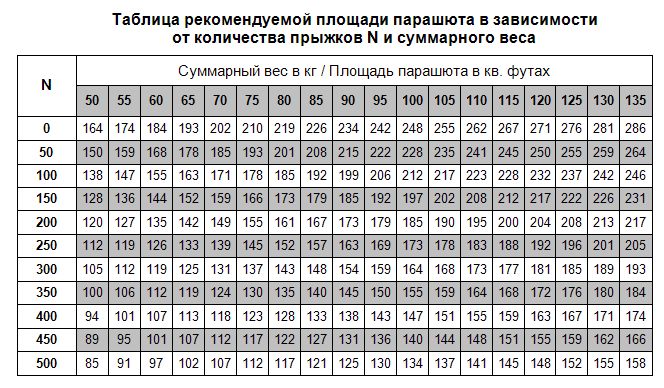 Рекомендации по выбору площади парашюта по мере увеличения количества прыжков